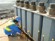 ■打設(2) 箱抜き部のグラウトは橋脚のプレ−ト下まで注入します。 脚内部に入ってグラウトが中まで注入されているかどうか確認し打設完了です。